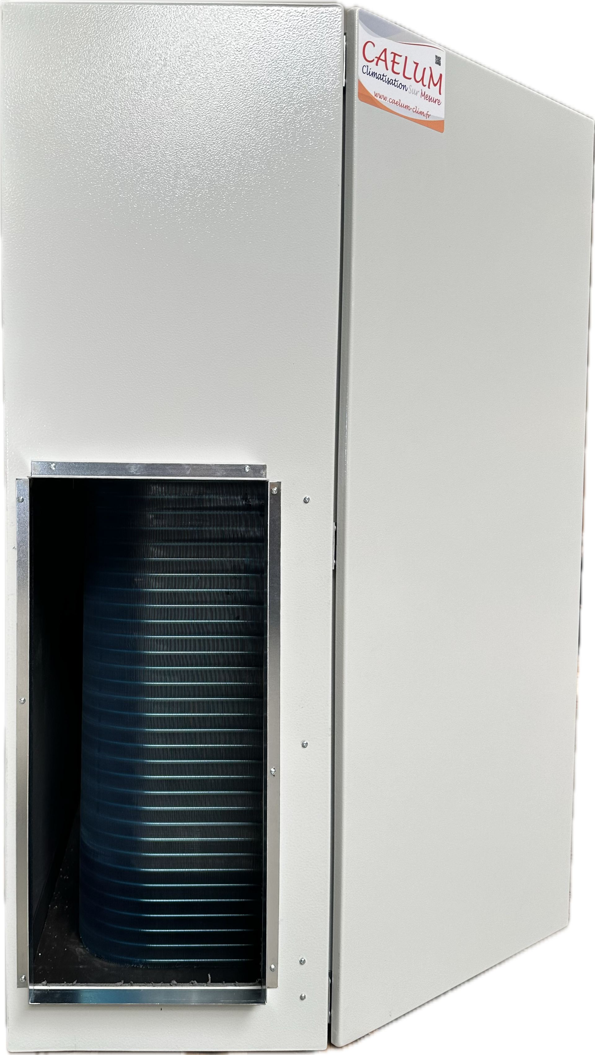 Dans le cas des groupes de condensation à air fabriqués par CAELUM, la condensation du fluide frigorigène se fait par circulation de l’air extérieur dans un échangeur de chaleur, à l’aide d’un ventilateur centrifuge. Ce ventilateur présente une forte pression disponible, autorisant le gainage des entrée et sortie d’air, permettant ainsi de placer le groupe de condensation dans le bâti. Cette solution est particulièrement intéressante losque qu’on ne dispose pas de surface extérieur pour installer un groupe de condensation.